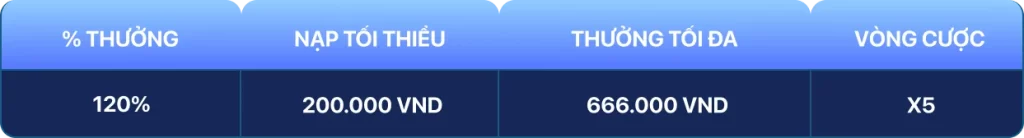 Đăng ký nạp lần đầu nhận ngay khuyến mãi 120% số tiền nạp đầu tiên.